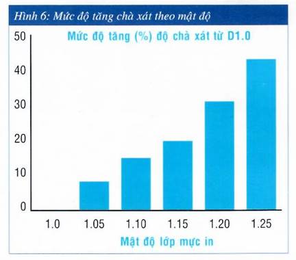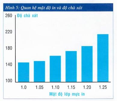 Độ chà xát của mực có liên quan đến mật độ lớp mực hay chiều dày lớp mực. Chúng ta có thể xây dựng số liệu tương quan giữa mật độ in và tỷ lệ % lớp mực qua chà xát như đồ thị (Hình 5). Sự thay đổi này tương ứng với chiều dày lớp mực và độ chà xát trở nên xấu khi mật độ in vượt quá 1,1D.