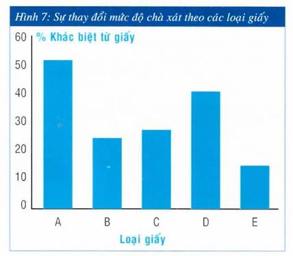 Các nghiên cứu về ảnh hưởng của giấy đến độ chà xát cũng được xem xét đến. Hình 7 chỉ ra sự so sánh của việc thử các loại giấy khác nhau với cùng điều kiện in tương ứng và cùng một loại mực